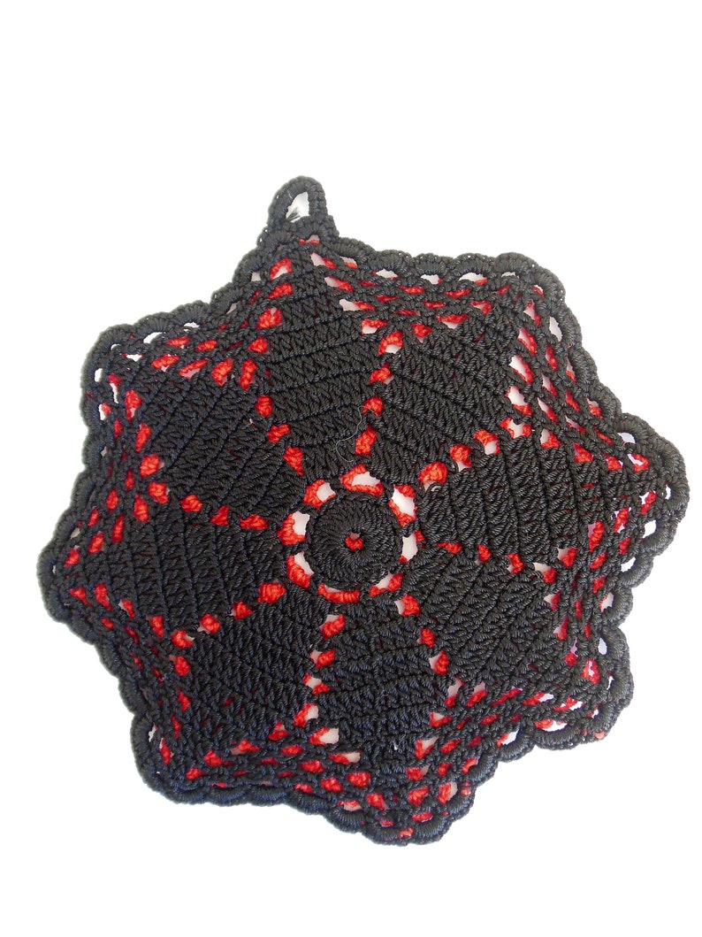 Pair of Pot Holders Red and Black Crocheted Hot Pads for